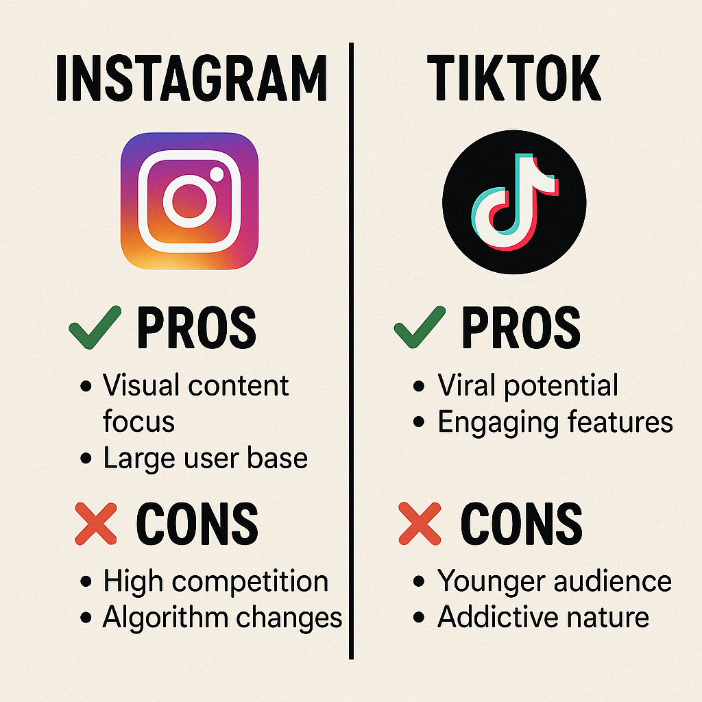 인스타그램과 틱톡은 각각의 장단점이 뚜렷한 플랫폼입니다. 틱톡은 빠른 노출과 젊은 층 타겟에 강하고, 인스타그램은 브랜드 축적과 다양한 콘텐츠 운영에 유리합니다. 두 플랫폼의 특성을 정확히 파악하고, 자신의 콘텐츠 성격과 타깃층에 맞게 선택하거나 병행 운영하는 것이 현명한 전략입니다. SNS 마케팅의 핵심은 '일관성과 타겟 맞춤 전략'입니다. 지금 바로 여러분의 콘텐츠 목적에 맞는 플랫폼을 선택해 보세요!